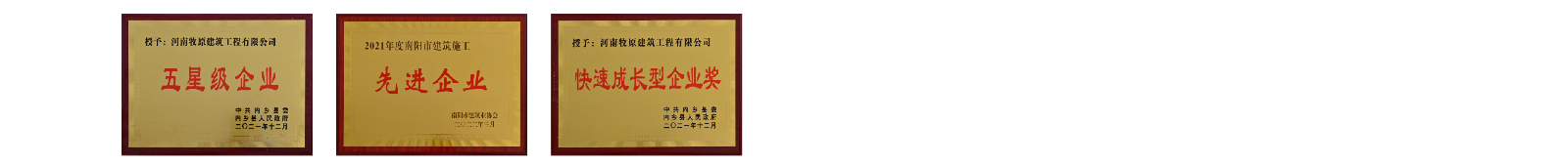2021年,擴(kuò)大經(jīng)營(yíng),快速發(fā)展,榮獲南陽(yáng)市建筑施工先進(jìn)單位、內(nèi)鄉(xiāng)縣快速成長(zhǎng)型企業(yè)獎(jiǎng)、內(nèi)鄉(xiāng)縣五星級(jí)企業(yè)。