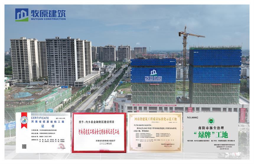 在金融街項(xiàng)目建設(shè)中,牧原建筑始終嚴(yán)控工程質(zhì)量,強(qiáng)化安全意識(shí),獲得了各級(jí)主管部門和行業(yè)、業(yè)主的認(rèn)可與信賴,其中一期項(xiàng)目已交付業(yè)主使用。(一期、二期)工程先后榮獲了河南省優(yōu)質(zhì)結(jié)構(gòu)工程、南陽(yáng)市優(yōu)質(zhì)結(jié)構(gòu)工程、河南省建筑工程質(zhì)量標(biāo)準(zhǔn)化示范工地、河南省建筑工程安全文明標(biāo)準(zhǔn)化示范工地、南陽(yáng)市揚(yáng)塵治理“綠牌”工地等資質(zhì)榮譽(yù)。